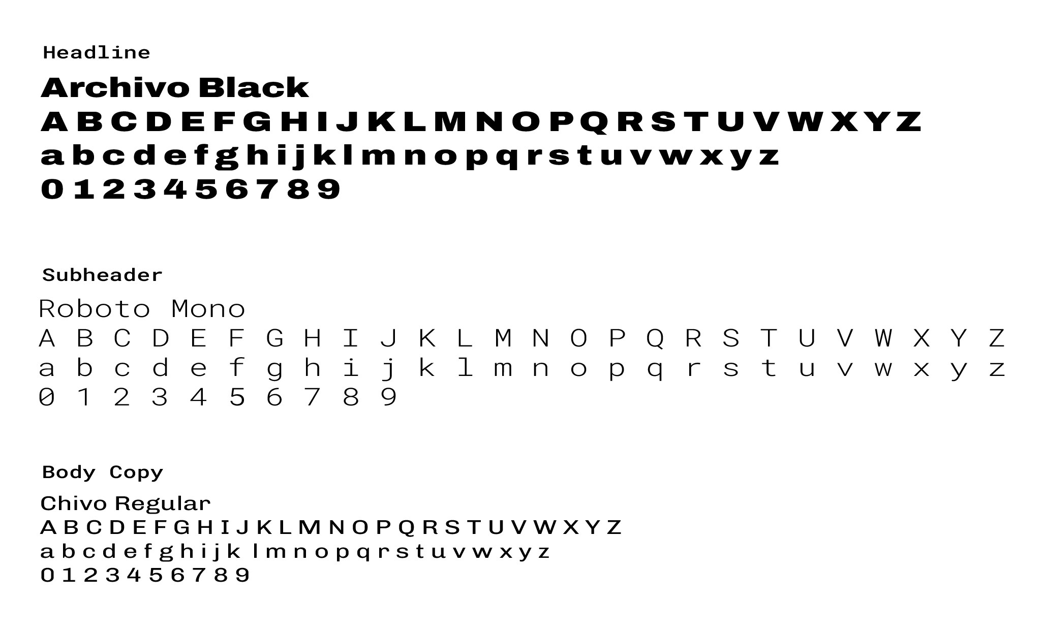 For the fonts, I used Archivo Black as the title font with the idea of bringing more impact alongside the logo. For body text in general, Chivo, and Roboto Mono as a supporting font. Both being used to balance with Archivo Black.